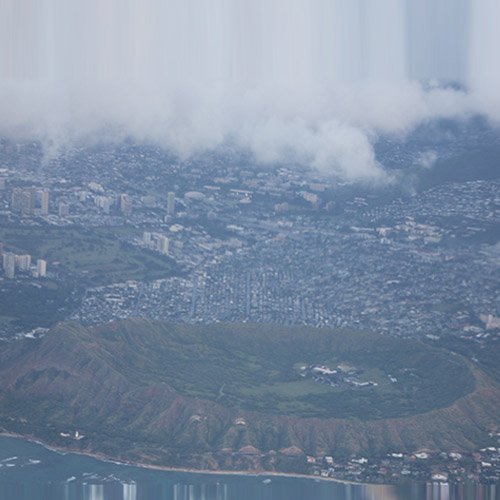 It is extremely difficult if not impossible to capture an entire volcano, and a city and clouds and the ocean in one single frame- all of which appear in early morning light while taking off from Honolulu to the Big Island.