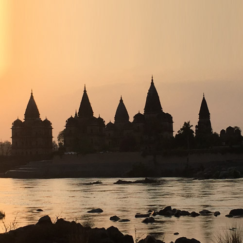 Few places in India surpass the serenity resulting from the crystal clear waters of the Betwa river silhouetted against the magnificient temples of Orchha in Madhya Pradesh just before sunset